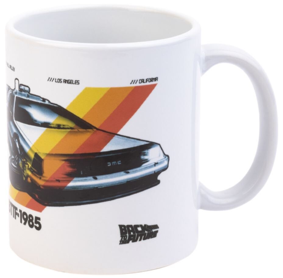 Keramický bílý hrnek s grafikou auta BTTF 1985 z filmu Návrat do budoucnosti. S tímto hrnkem se v současnosti rozhodně nezasekne žádný cestovatel časem.