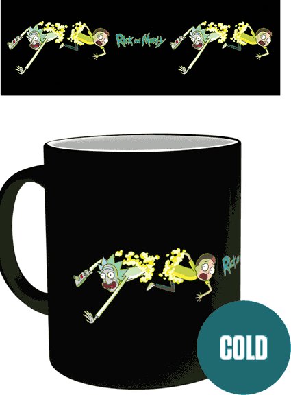 Oficiální hrnek a doplňkové zboží z katalogu produktů s logem, fotografiemi a grafikou amerického animovaného seriálu Rick and Morty.