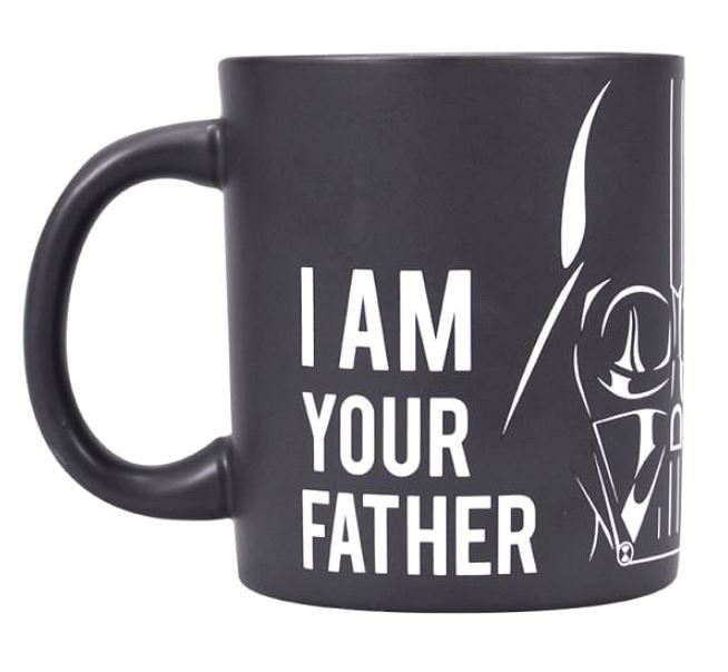 Černý keramický hrnek s bílým potiskem Darth Vadera "I am your father" a červeným nápisem "Star Wars".