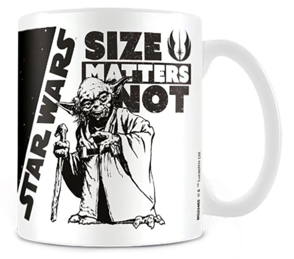 Černý keramický hrnek s grafickým potiskem Yody a nápisem: ,,Size Matters Not\'\' z filmové ságy Hvězdné války. Hrnek je vhodný pro všechny menší i větší fanoušky.