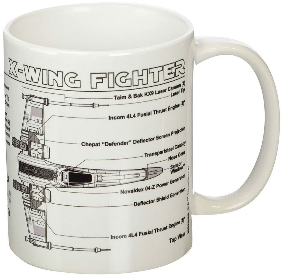 Bílý keramický hrnek s grafickým potiskem x-wing fighter sketch ze slavné filmové sci-fi ságy Star Wars.