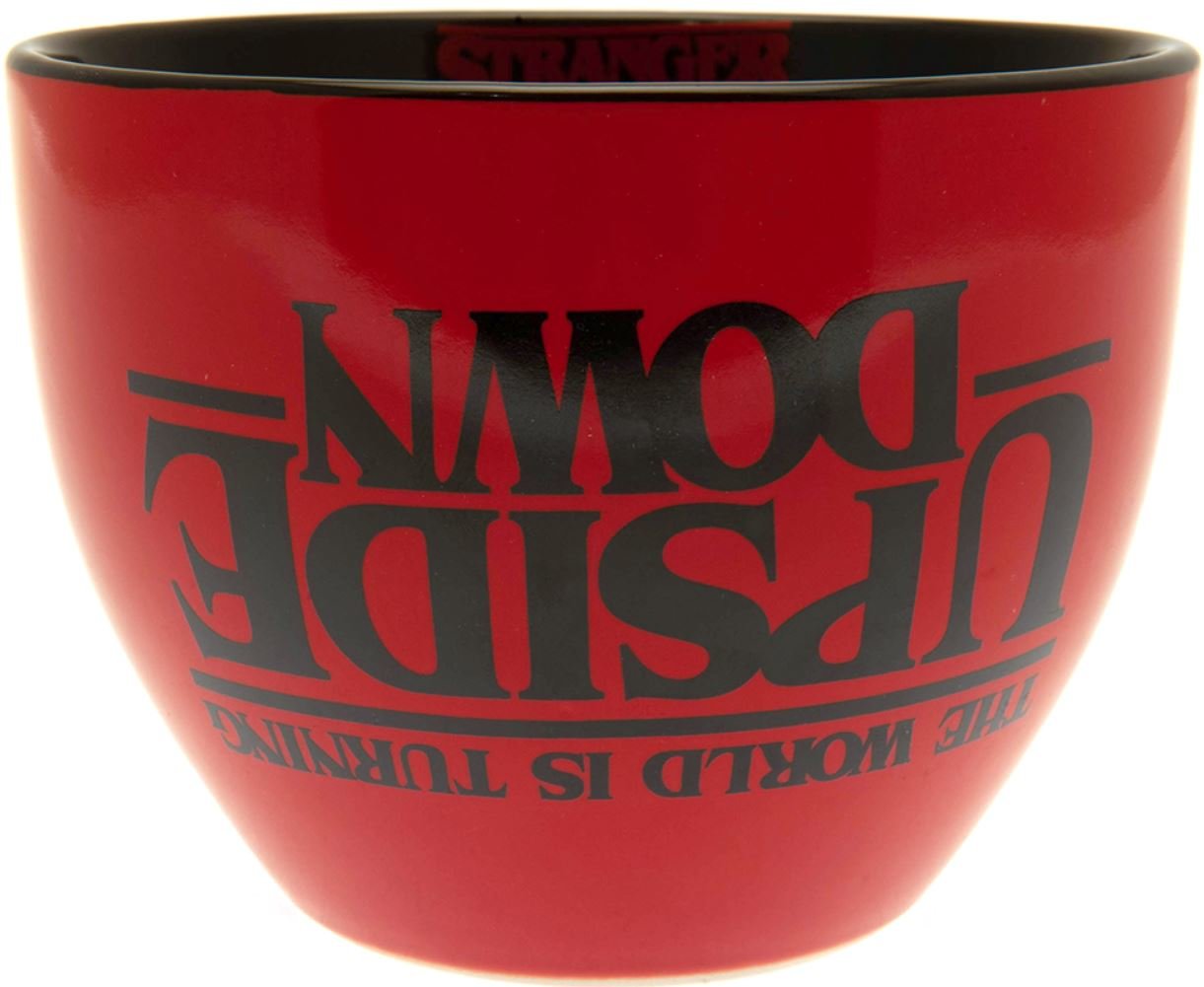 Červený keramický hrnek s grafikou World Upside Down ze seriálu Stranger Things.