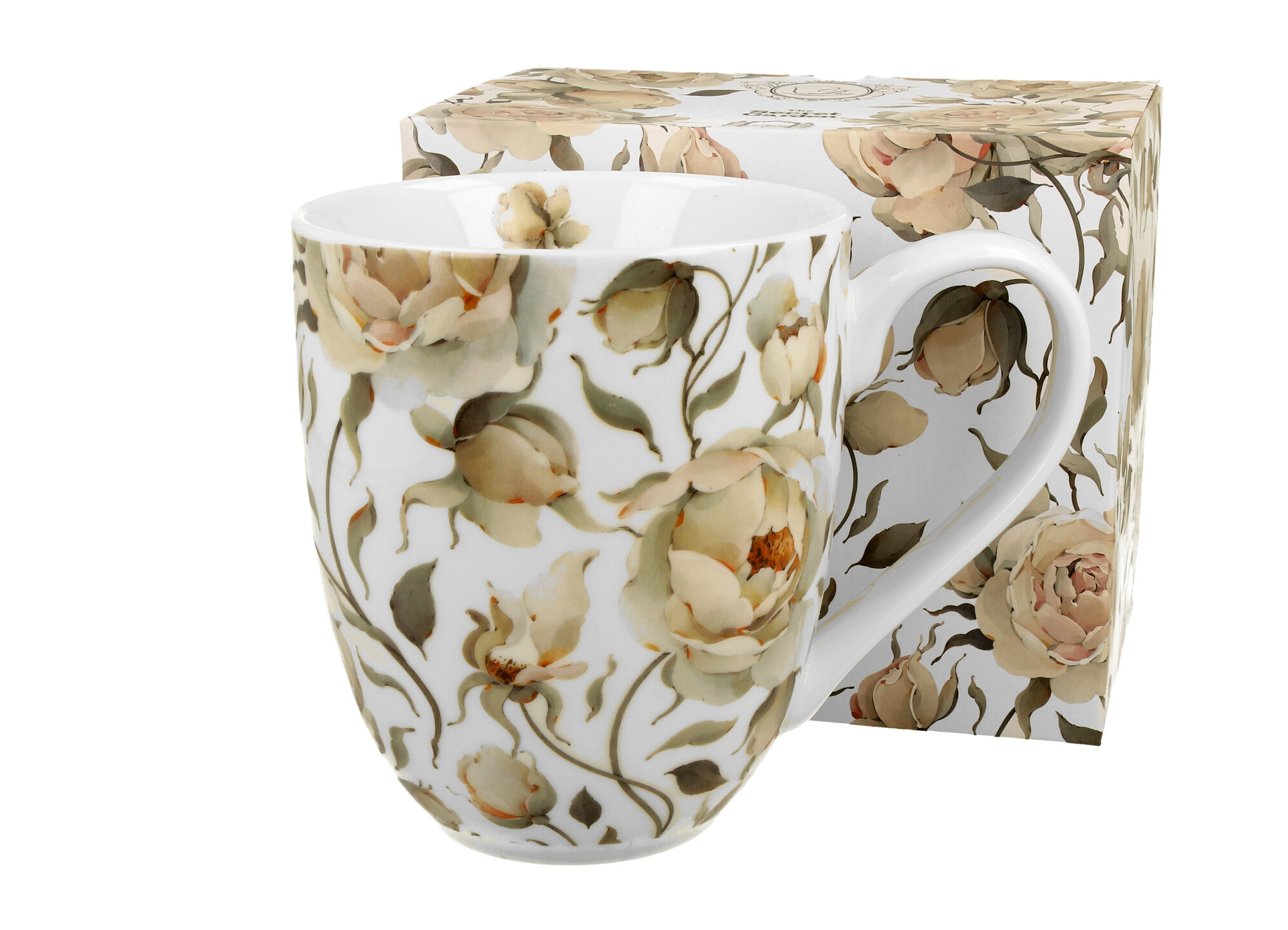 Kubek XXL ENGLISH ROSES WHITE wchodzący w skład serii Kwiaty Royal, wykonany z porcelany New Bone China, charakteryzującej się elegancką i naturalną kremowo - białą barwą z delikatnym połyskiem, a także wyjątkową wytrzymałością.