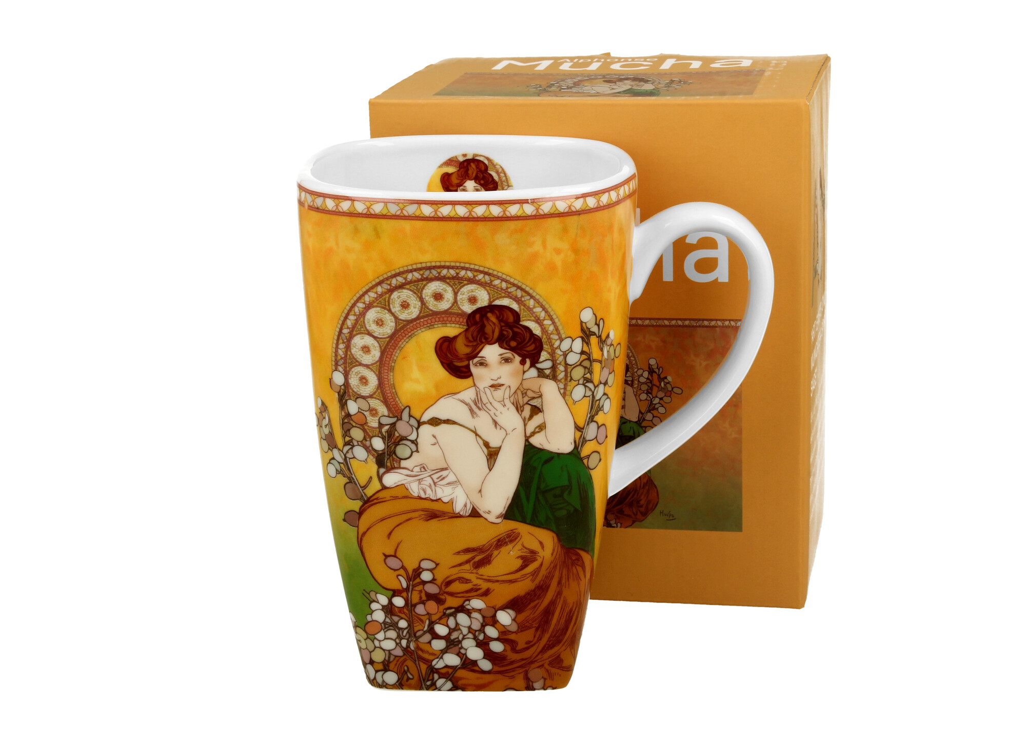 Kubek kwadratowy TOPAZ inspired by A. Mucha wchodzący w skład serii Art Gallery, wykonana z porcelany New Bone China, charakteryzującej się elegancką i naturalną kremowo - białą barwą z delikatnym połyskiem a także wyjątkową wytrzymałością przy zachowaniu lekkości i delikatności.