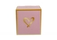 Hrnek je zdobený zlatým srdcem na pastelově růžovém podkladu.