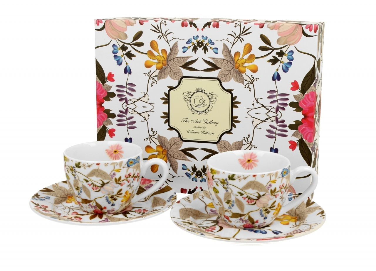 Design hrnků je ozdoben jemnou kompozicí pastelových květů, éterických listů a větviček, což je charakteristickým rysem Kilburnovy botanické tvorby. Tento nádherný vzor zobrazuje květiny a přírodní motivy, které umocňují eleganci a jemnost celého kousku.