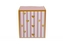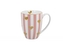 Hrnek je zdobený vzorem malých zlatých srdíček na pozadí růžových a bílých proužků.