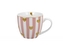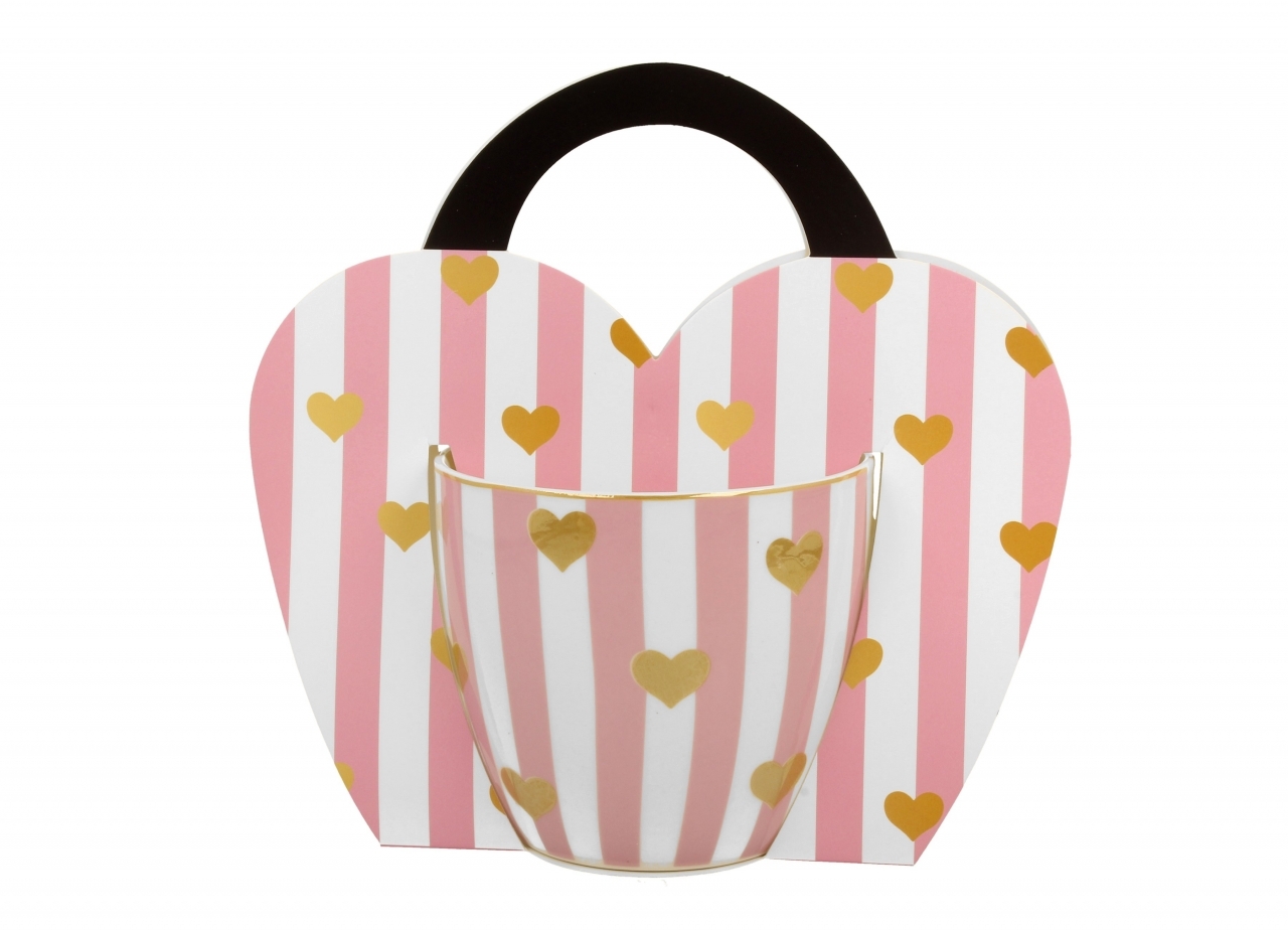 Hrnek je zdobený vzorem malých zlatých srdíček na pozadí růžových a bílých proužků.
