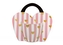 Hrnek je zdobený vzorem malých zlatých srdíček na pozadí růžových a bílých proužků.