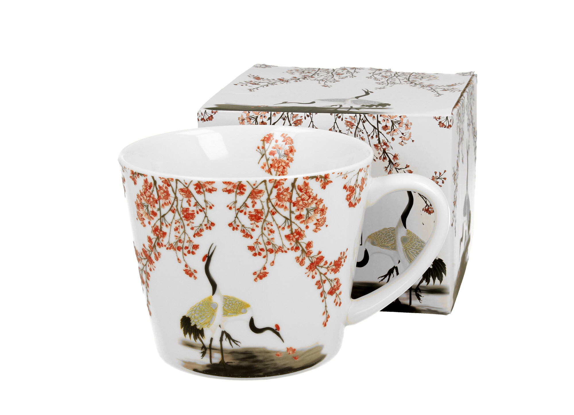 Duży kubas prosty 610 ml SAKURA I ŻURAWIE wchodzące w skład serii Art Gallery, wykonany z porcelany New Bone China, charakteryzującej się naturalnym kremowo-białym kolorem z delikatnym połyskiem oraz wyjątkową wytrzymałością i trwałością, zachowując lekkość i finezję.