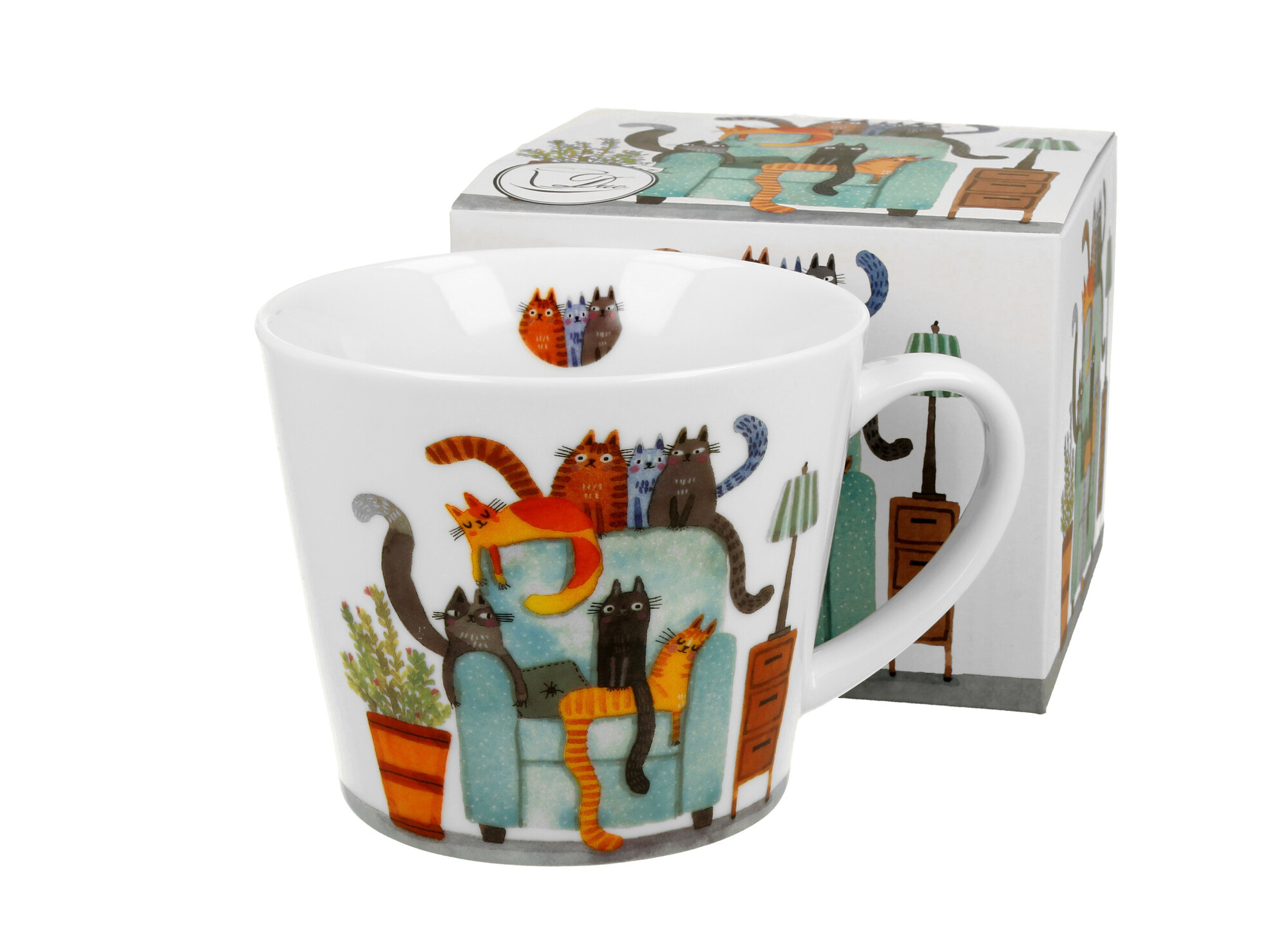 Duży kubas prosty 610 ml Koci Świat KOTY NA FOTELU wchodzące w skład serii Animals, wykonany z porcelany New Bone China, charakteryzującej się naturalnym kremowo-białym kolorem z delikatnym połyskiem oraz wyjątkową wytrzymałością i trwałością, zachowując lekkość i finezję.