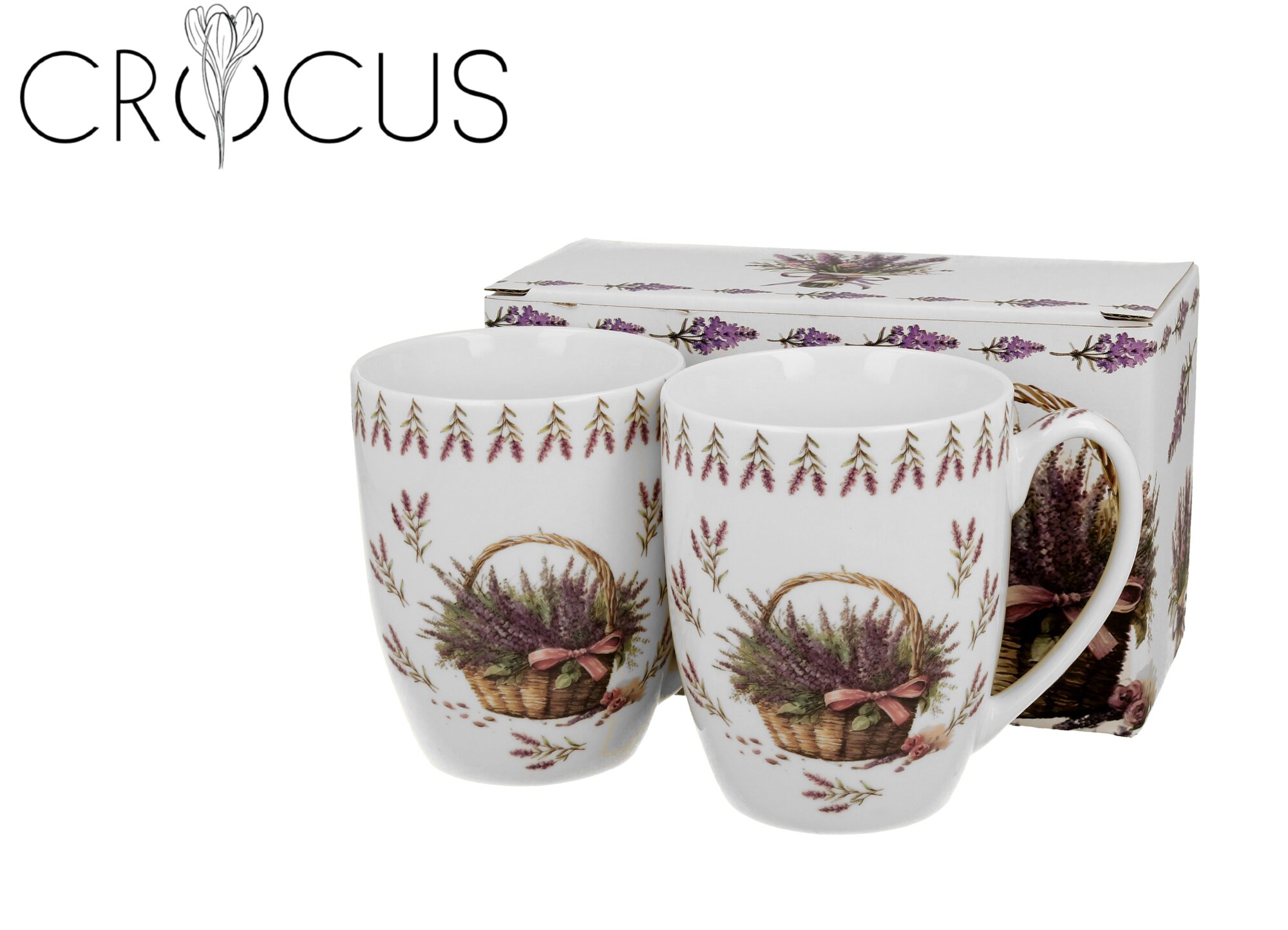 Komplet dwóch kubków Kosze Kwiatów LAWENDA wchodzący w skład serii CROCUS, wykonany z porcelany New Bone China, która charakteryzuje się naturalnym kremowo-białym kolorem z delikatnym połyskiem oraz wyjątkową wytrzymałością i trwałością, zachowując lekkość i finezję.