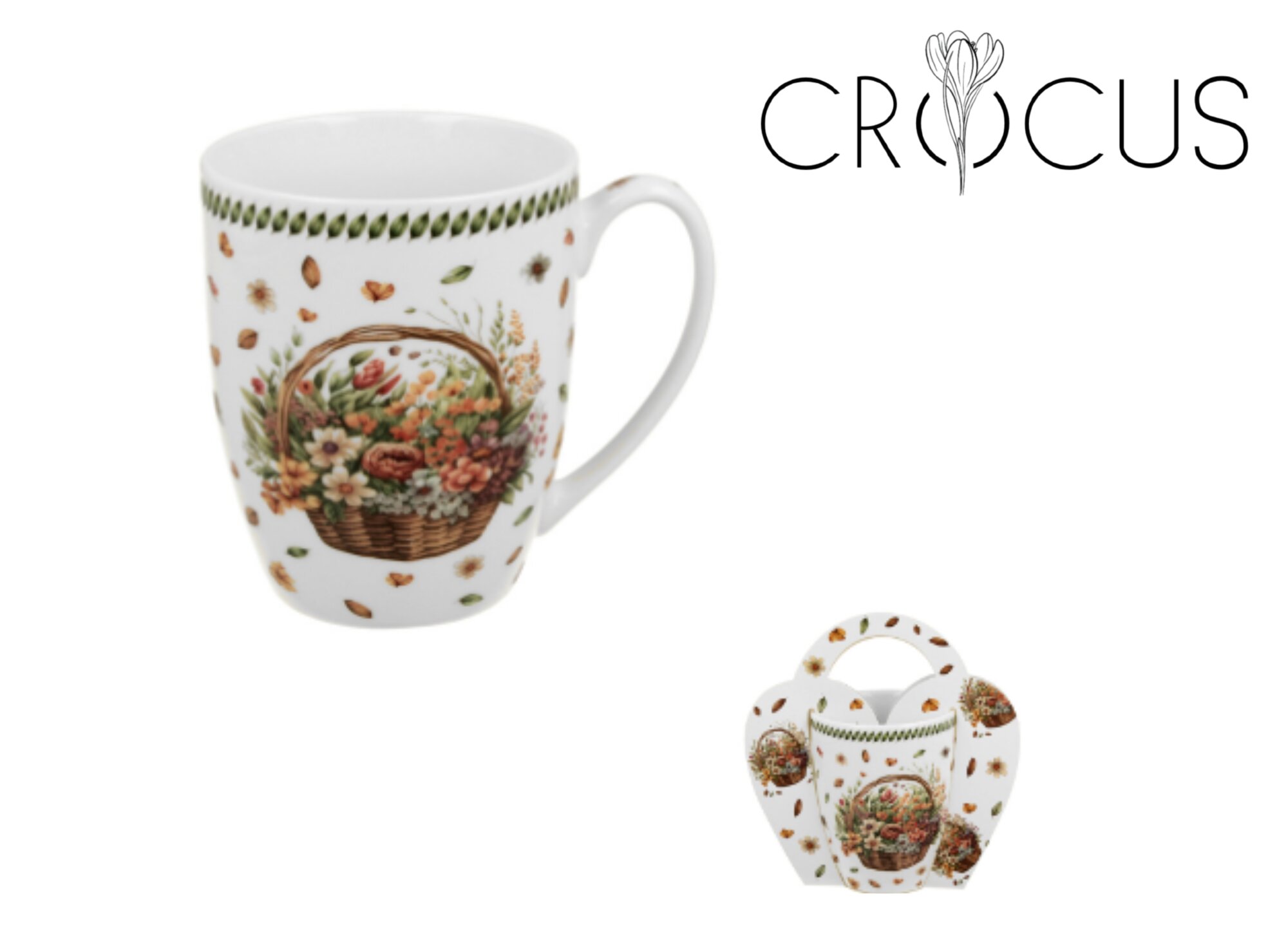 Kubek 350 ml w koszyczku Kosze Kwiatów KWIATY POLNE wchodzący w skład serii CROCUS, wykonany z porcelany New Bone China, która charakteryzuje się naturalnym kremowo-białym kolorem z delikatnym połyskiem oraz wyjątkową wytrzymałością i trwałością, zachowując lekkość i finezję.