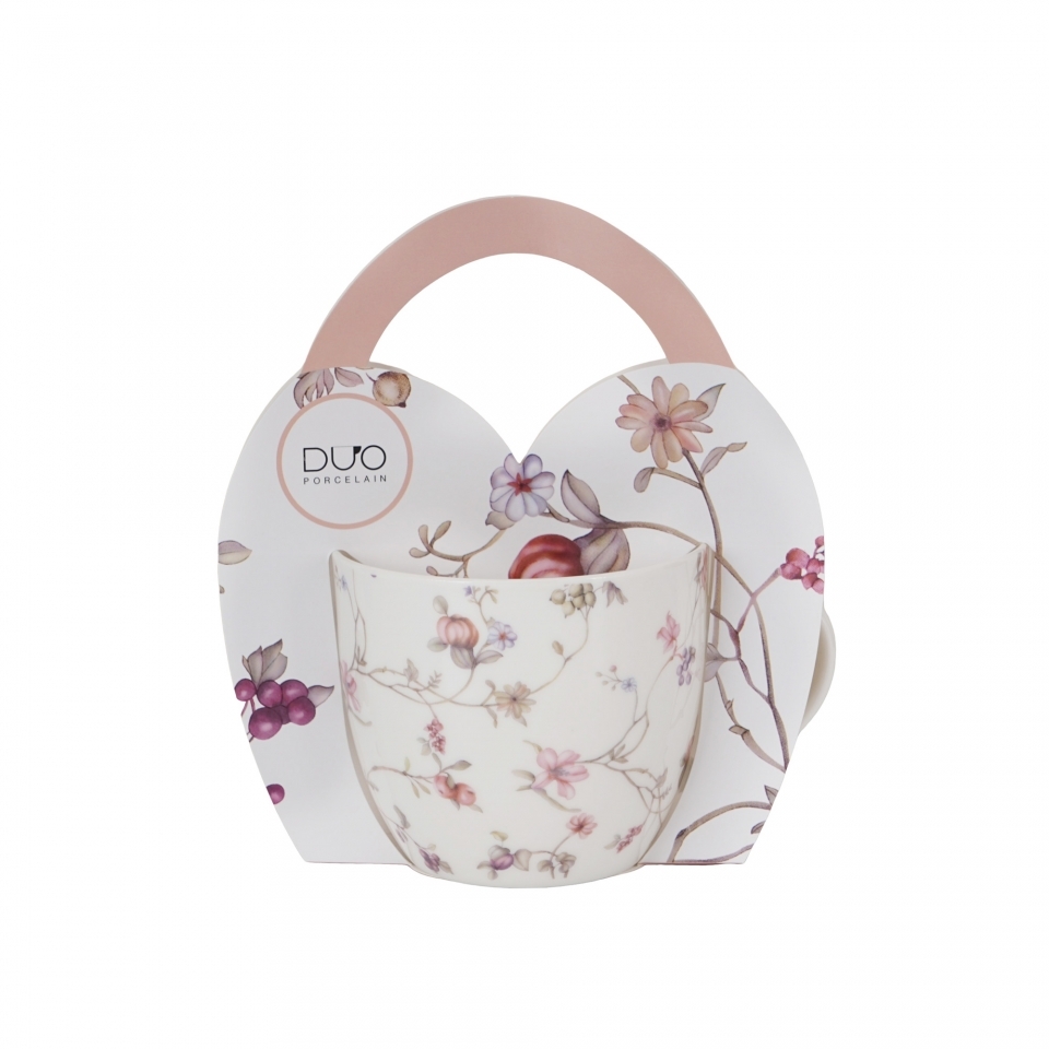 Hrnek o objemu 460 ml v košíku SAFA, součást řady Flowers Classic, vyrobený z porcelánu New Bone China, který se vyznačuje přírodní krémově bílou barvou s jemným leskem a výjimečnou pevností a odolností.