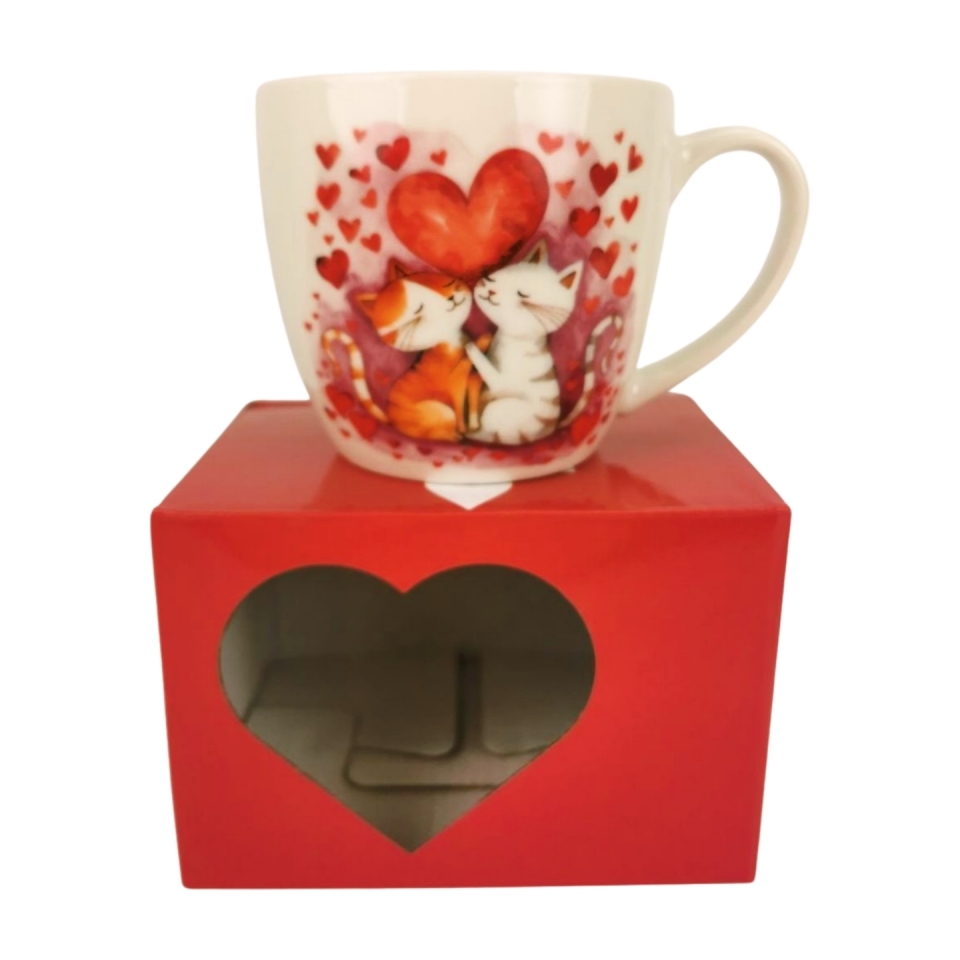 Zdobeno motivem lísajících se kočiček pod srdíčkem. Všude kolem nich jsou rozprostřené malé srdíčka což vytváří romantickou atmosféru. Kombinace růžové a červené s bílým porcelánem vytváří harmonickou kompozici.