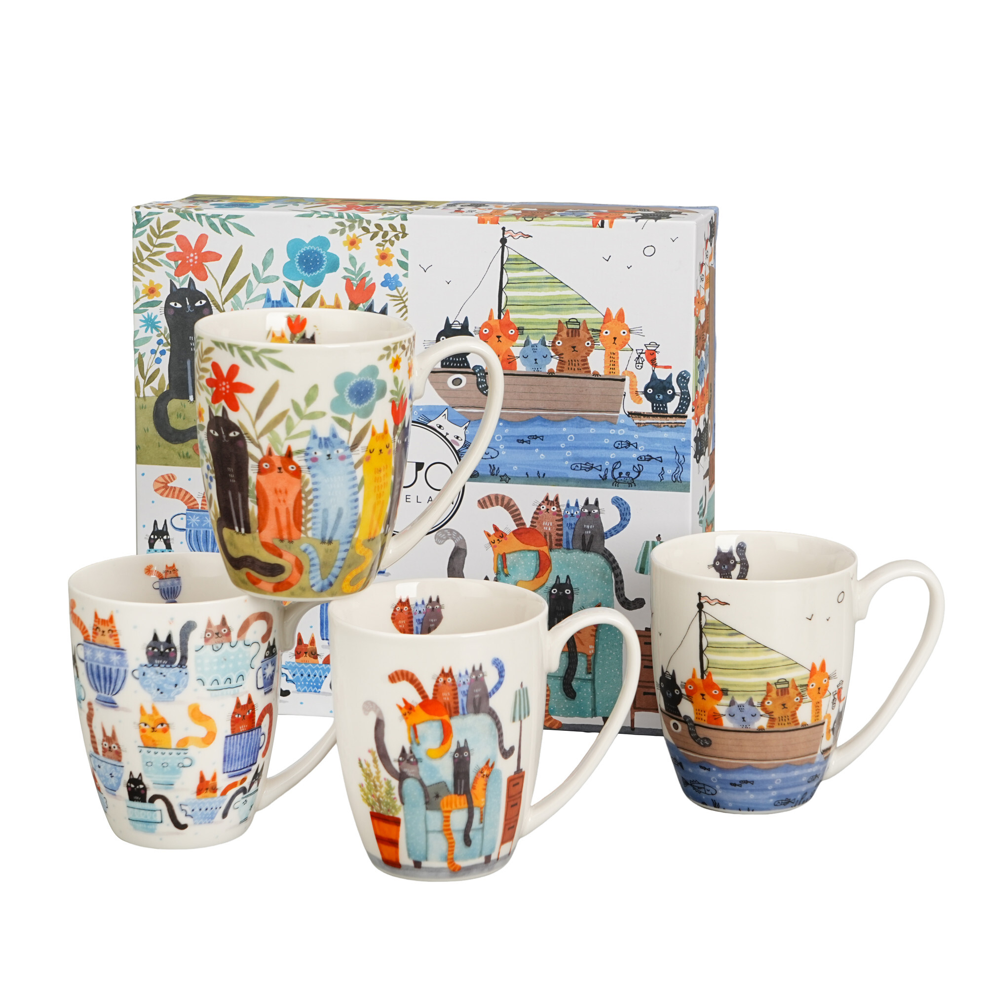 Komplet czterech kubków Koci Świat wchodzący w skład serii Animals, wykonany z porcelany New Bone China, która charakteryzuje się naturalnym kremowo-białym kolorem z delikatnym połyskiem oraz wyjątkową wytrzymałością i trwałością, zachowując lekkość i finezję.