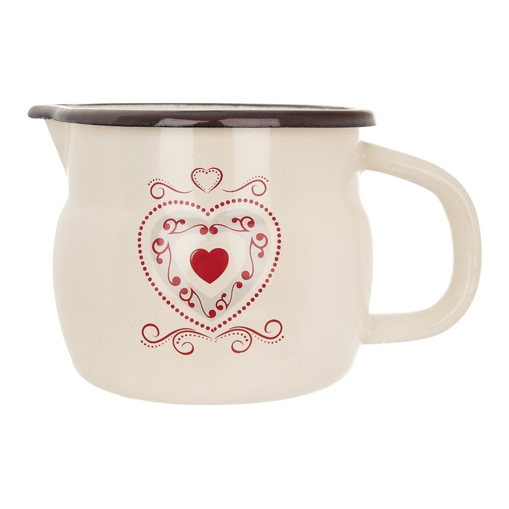 Hrnek smaltovaný baňatý s hubičkou je vhodný na všechny typy spotřebičů. Vhodný do myčky nádobí. Rozměry: pr. 10 cm, v. 9,5 cm, objem 0,8 l. Dekor TONČA.