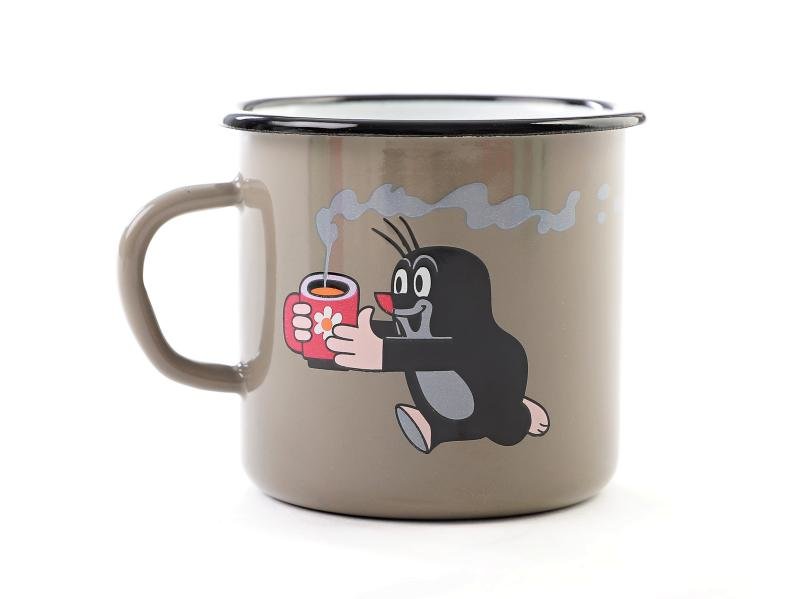 Smaltovaný hrneček s jedním uchem. Objem 0,25L. Motiv Krteček a hrneček číst celé