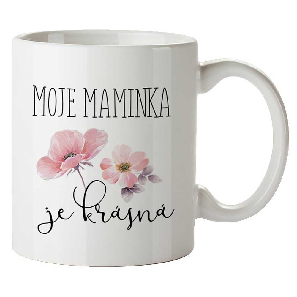 Originální dárek pro maminku k narozeninám, k svátku nebo pro radost. Keramický hrnek s potiskem - Moje maminka je krásná.