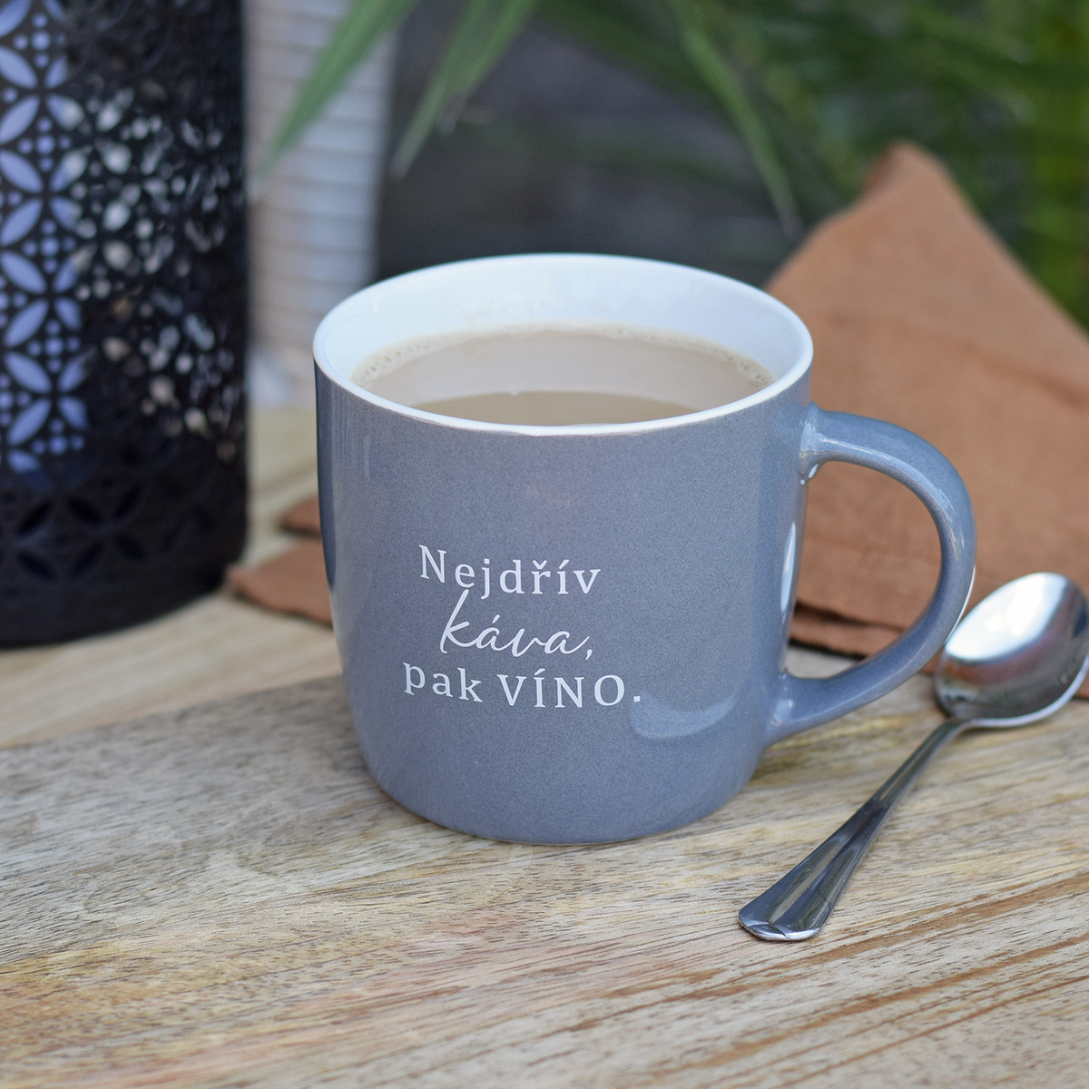 HOUSEDECOR Porcelánový šedý hrnek - Nejdřív káva, pak víno.