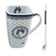 Hranatý porcelánový hrnek o objemu 600 ml s elegantním dekorem modrých teček na bílém podkladě.