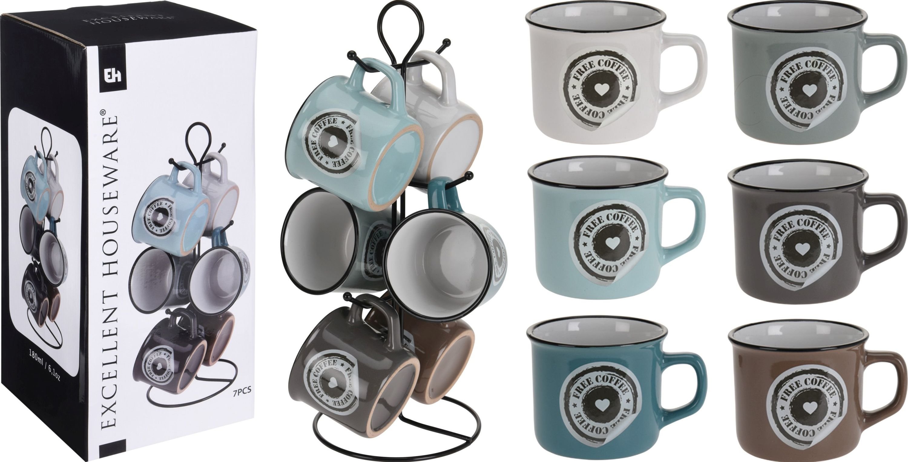 Sada 6ti hrnečků zavěšených na kovovém stojánku. Materiál - keramika, kov. Rozměry - hrneček - výška 7,2 cm, průměr 7,5 cm, výška stojánku 32 cm. Hrnky jsou vhodné do myčky nádobí i do mikrovlnné trouby.