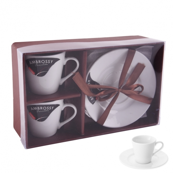 Hrnek s uchem a podšálek. Materiál: porcelán. Barva bílá. Sada 2+2 ks. Rozměry: objem 0,09 l, pr. š. 6 cm, pr. podš. 12 cm.