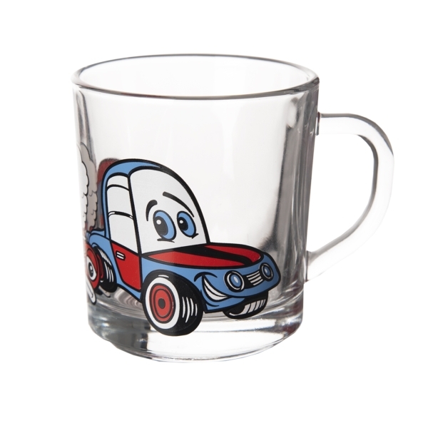 Hrnek s uchem. Materiál: sklo. Dekor AUTO. Rozměry: objem 0,29 l, pr. 8 cm, v. 8,5 cm. Lze mýt v myčce a použít v MVT. Vhodné pro děti od 3 let.
