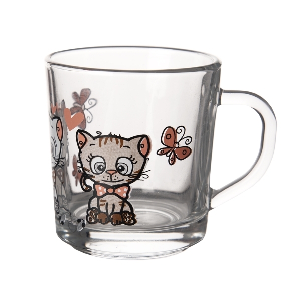 Hrnek s uchem. Materiál: sklo. Dekor KOCOUŘI. Rozměry: objem 0,29 l, pr. 8 cm, v. 8,5 cm. Lze mýt v myčce a použít v MVT. Vhodné pro děti od 3 let.