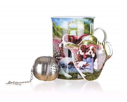3dílná čajová sada DOGSurčená pro louhování sypkých čajů. Sada obsahuje: 1 x keramický hrnek o objemu 300 ml (výška 10 cm, horní průměr 7,6 cm, dolní průměr 6,9 cm), 1 x nerezové sítko a 1 x tácek pod sítko.