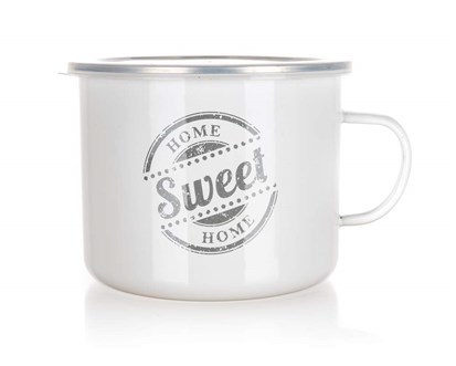Hrnek smaltovaný SWEET HOME 1,4 l, rozměry: 14 x 11 cm, materiál: karbonová ocel s 2vrstvým smaltovaným povrchem, nerezový okraj, součástí je plastové uzavíratelné víčko.