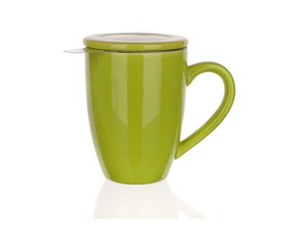 Hrnek s víčkem 350 ml BONNET, zelená glazura, materiál - keramika, nerezové sítko na louhování čaje. Rozměry hrnku: výška 12 cm, průměr 8,5 cm. Hrnek i víčko lze používat do mikrovlnné trouby a mýt v myčce na nádobí. číst celé