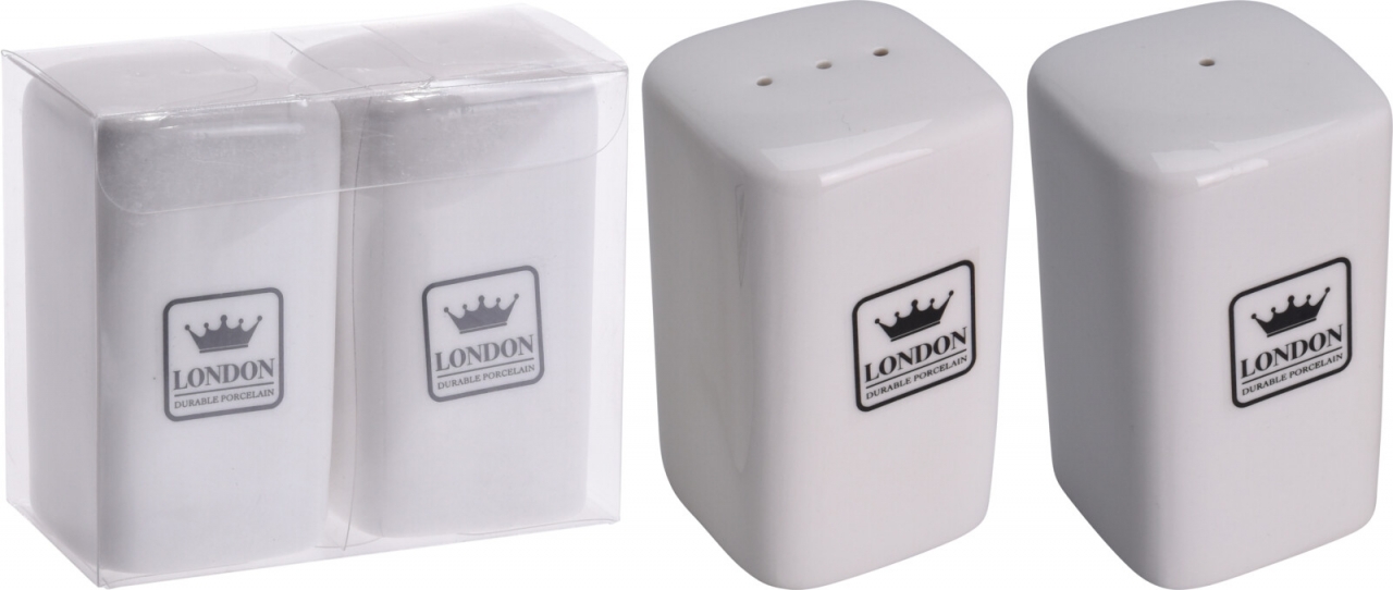 Sada 2 ks porcelánových kořenek na sůl a pepř v průhledné krabičce. LONDON DURABLE PORCELAIN je nálepka, porcelán je bez potisku.