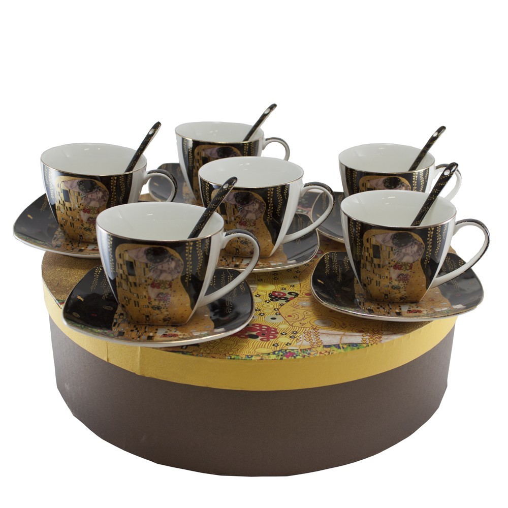 HOME ELEMENTS Sada 6 ks - šálky 250 ml s podšálky a lžičkami, Klimt, Polibek tmavý