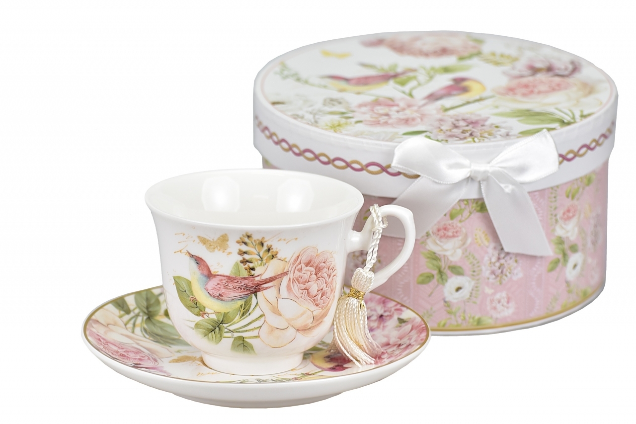 Porcelánový hrnek s podtalířkem z kolekce Birds v dárkové papírové krabičce.