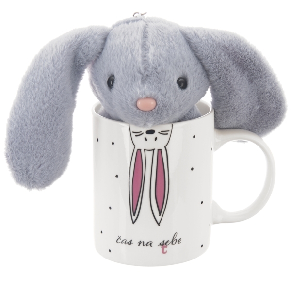 Hrnek s dekorem a s plyšovým zajíčkem. Dekor doplňuje plyšové zvířátko. Materiál: porcelán, polyester, plast, kov. Rozměry: objem 0,39 l, pr. 8 cm, v. 9,5 cm. Vhodné jako dárek. Pro děti od 3 let. Hrnek vhodný do myčky i MVT. Plyšáka lze prát ručně na 30 °C, poté nechat samovolně uschnout.