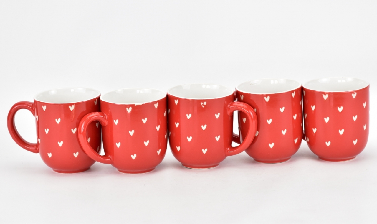 Červený hrneček s něžnými srdíčky pro radost. II. jakost z důvodu vady glazury.