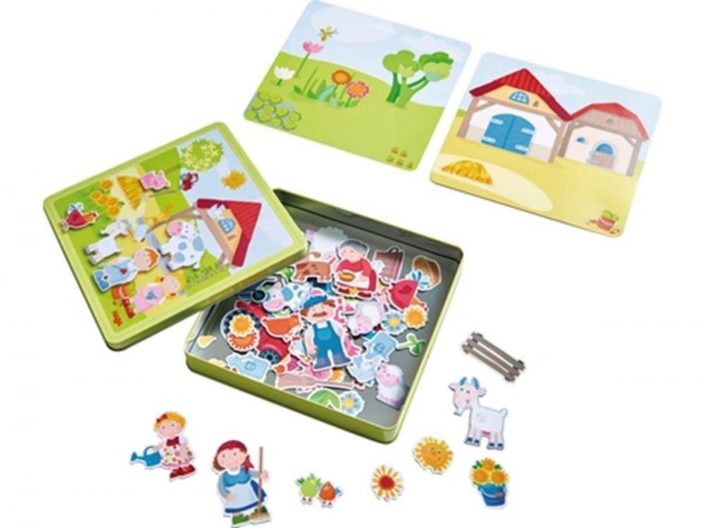 Magnetická skládačka obsahuje čtyři tematické obrázky zachycující život na farmě - od farmářské rodiny přes hospodářská zvířata až po rostliny a další doplňky. Díky kovové krabici je hra elegantně uskladněná a snadno přenosná, takže si ji vaše děti mohou vzít kamkoliv s sebou.
