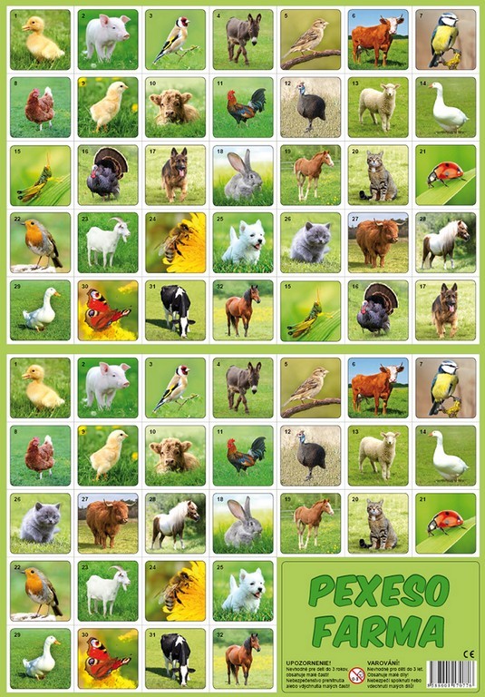 - Obsahuje 32 dvojic karet s obrázky zvířátek z farmy
