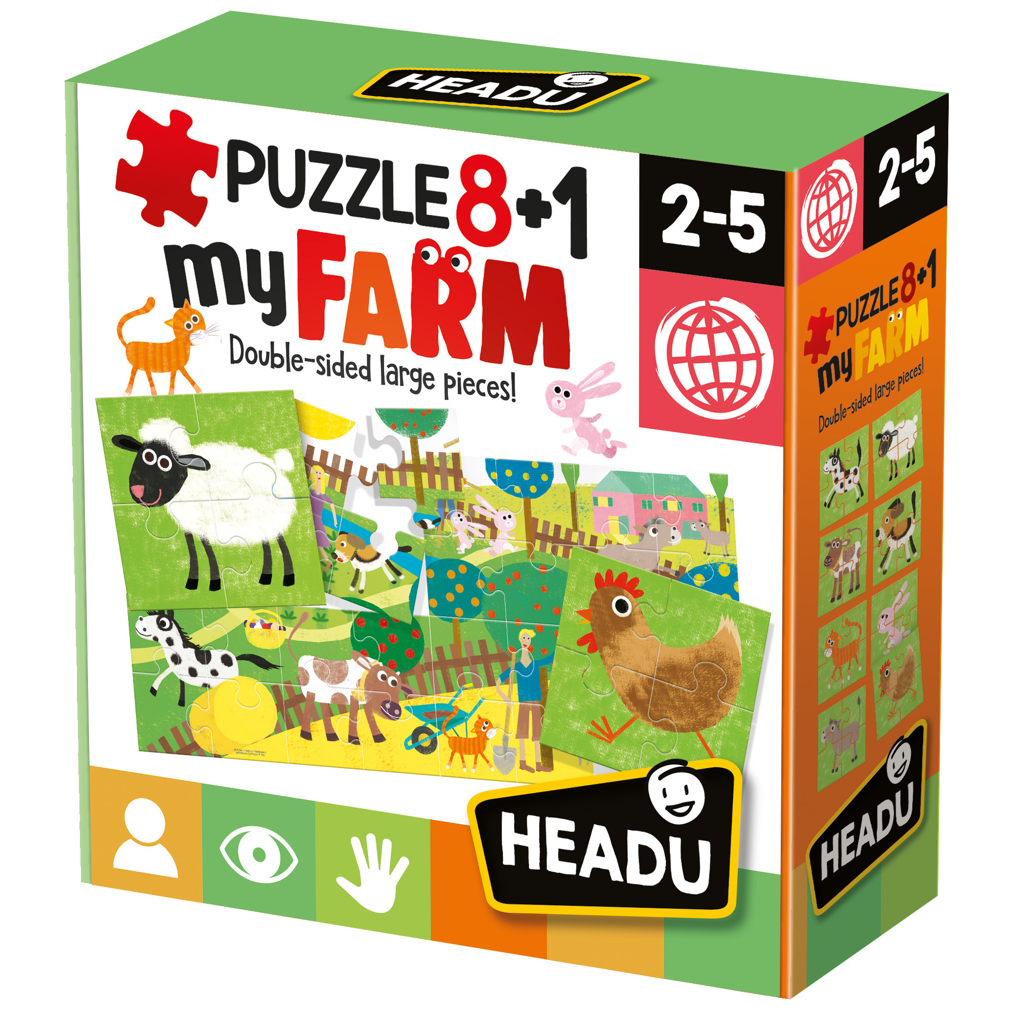 Velké oboustranné dílky! Velké, oboustranné a odolné dílky určené ke hře a objevování. S dílky otočenými na jednu stranu mohou děti sestavit8 úžasných hospodářských zvířátek a po otočení na druhou stranu si postaví velkou barevnou farmu.