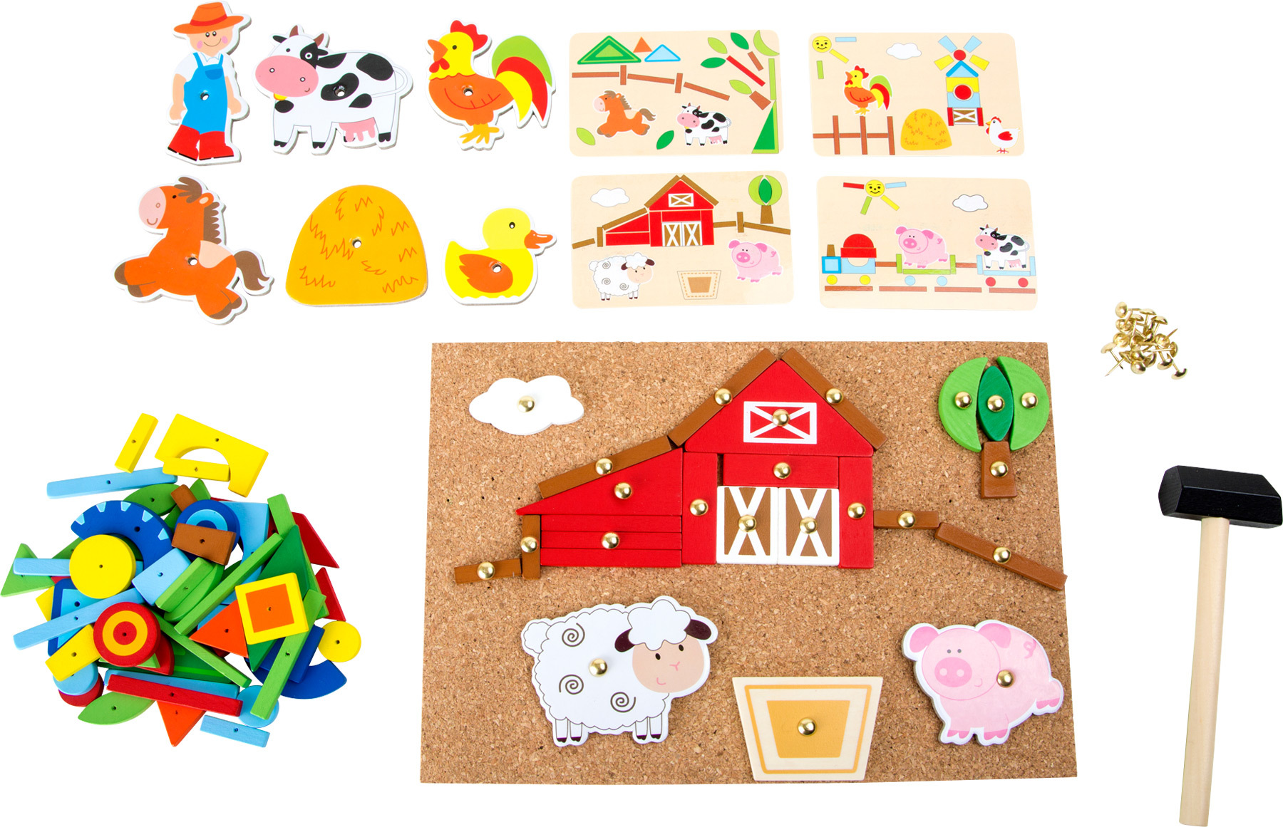 Kreativní hra pro malé farmáře, kteří se nebojí vzít do ruky kladívko. Smyslem hry je vytvořit obrázek dle předlohy za pomocí kladívka, připínáčků a korkové tabulky. Celá kreativní sada je zabalená do barevné korkové krabičky a lehce se přenáší. Uvnitř balení naleznete domácí zvířata, farmáře, geometrické tvary různých barev. 4 karty jako předlohy s motivem světa zvířat na farmě. Rozměr balení: 19 x 26 x 4.5 cm, kladivo: 14 x 4 cm Vhodné pro děti od 6 let