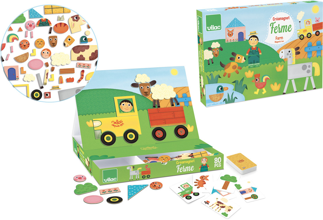 Hra obsahuje 80 dřevěných magnetů a 30 kartiček s obrázky s tematikou farmy. Obrázky skládáte podle svých představ nebo dle přiložených kartiček. Vše baleno v boxu s vertikální tabulkou, můžete tak hrát kdekoliv. Ilustrovala Mélusine Allirol. Hračky Vilac mají značku francouzské agentury ADEME, to znamená, že tyto dřevěné hračky jsou vyráběny ekologicky. Šetří životní prostředí, neznečišťují půdu, vodu a vzduch, neplýtvají energiemi. Již více než 100 let plní značka Vilac dětské sny. Společnost Vilac sídlí hluboko v srdci pohoří Jura, obklopena horami, jezery a lesy. Tato francouzská společnost vyrábí od roku 1911 dřevěné hračky v klasickém, starodávném stylu s moderními barvami a vzory. Hračky Vilac jsou jedinečné, nikdy nevyjdou z módy a dokáží okouzlit všechny generace. Vilac pomáhá utvářet dětskou představivost svými radostnými ilustracemi či dizajny a reinterpretací klasických hraček, které se jen tak neopotřebují. Děti dostávají na Vánoce a narozeniny spousty hraček, většina z nich je však nezaujme na dlouhou dobu, láska k hračce se nenaplní. Dřevěné hračky Vilac vzbuzují vášeň i o 50 let později, když jako dospělí náhodou najdete v podkroví hračky, které jste jako děti milovali. Vilac již 100 let propojuje děti s hračkami, které si oblíbí a váží si jich. A proč je děti tak milují? To zůstává tajemstvím firmy Vilac.