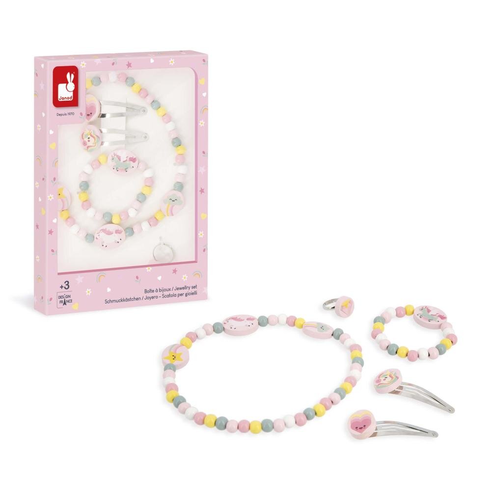 Dodajte detskému outfitu šmrnc! Táto súprava šperkov s jednorožcom je vhodná pre deti od 3 rokov. Obsahuje náhrdelník, náramok, prsteň a dve spony, všetko s báječným motívom jednorožca! 5 drevených šperkov, ktoré sa hodia k vášmu účesu. Táto súprava šperkov, ktorá je ideálna pre fanúšikov šperkov alebo čohokoľvek magického, umožňuje deťom vyjadriť svoju osobnosť. Môžu robiť to, čo robia dospelí a nosiť svoje vlastné šperky, aby presadili svoj štýl a vkus! Pekné farby a poetické ilustrácie sú neodolateľné: jednorožce, dúhy, hviezdy, srdiečka... Pre vzhľad plný šarmu a sebavedomia! Táto sada 5 šperkov jednorožca je vyrobená z dreva pochádzajúceho z lesov obhospodarovaných udržateľným spôsobom. V Janod sú jednorožci šikovní a používajú mágiu, aby udržali svoje tajomstvá. Impulzné a ikonické sa vyvíjajú v poetickom vesmíre nadčasových farieb. Tak ukáž svoj štýl!