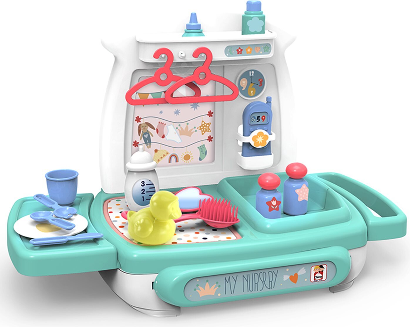 sada obsahuje: 16 příslušenství k péči o vaše dítě (hřeben se zrcátkem, lahvičku na pití, příbor, telefon a mnoho dalšího..)