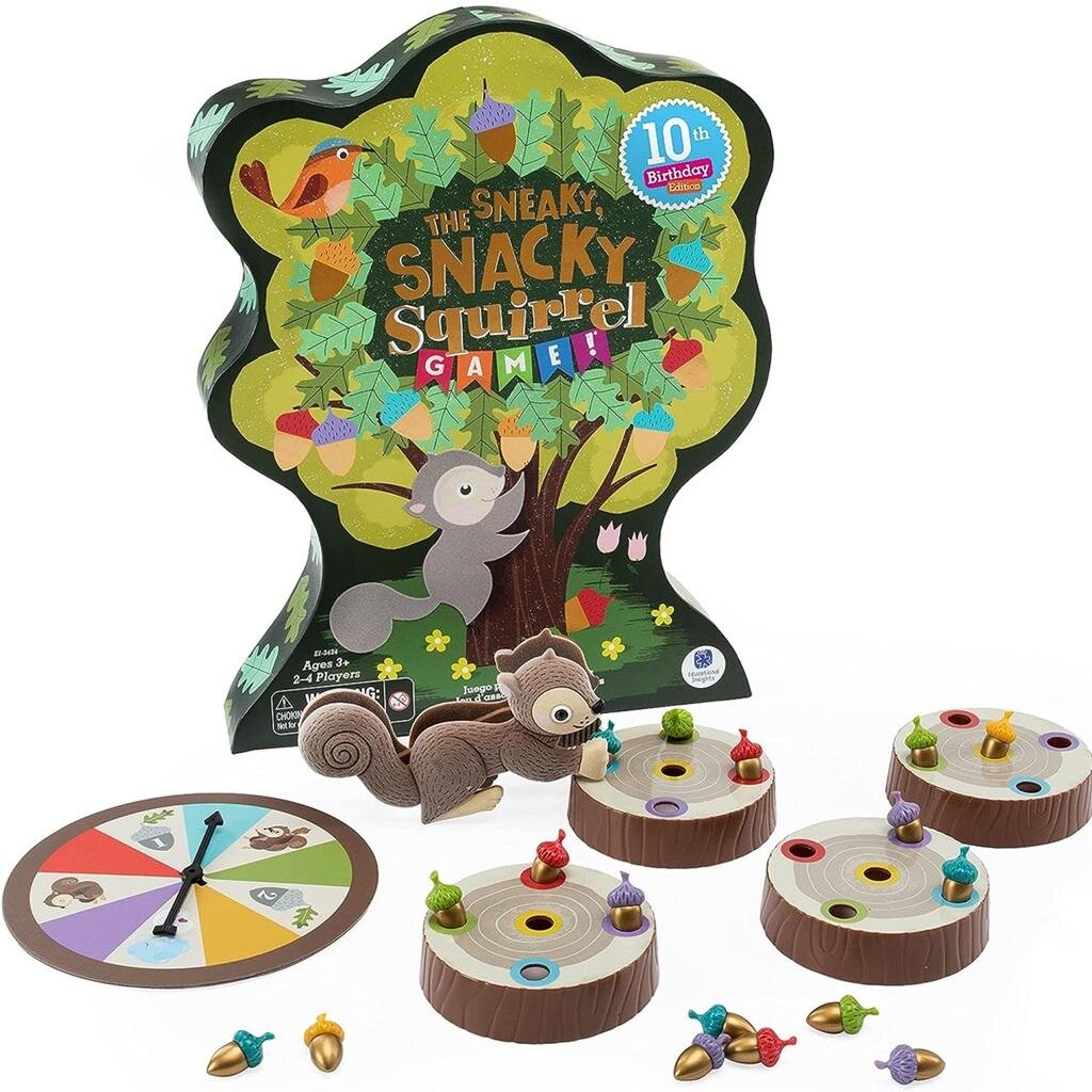 Sprytna Wiewiórka - Gra dla Najmłodszych - Edycja limitowana Specjalna limitowana edycja kolekcjonerska Nagrodzona 7 nagrodami, w tym zwycięzca Nappa Games Honor Winner. Najlepiej sprzedająca się gra dla przedszkolaków. Nadchodzi zima i wiewiórki są głodne! Pomóż im zdobyć pożywienie, wypełniając swój pień smacznymi żołędziami, które pasują do każdego kolorowego otworu w podstawce. Wypełnij swój pień jako pierwszy, a wygrasz! Gra planszowa dla dla 2 do 4 graczy. Rozwija myślenie strategiczne, koordynację wzrokowo-ruchową i przygotowuje do umiejętności pisania odręcznego. Ćwiczy pamięć i uwagę. Uczy rozpoznawania kolorów oraz sprawnej manipulacji dłonią. Zawiera: Kolorową planszę do gry w kształcie drzewa, wiewiórkę - chwytak, 20 złotych żołędzi z kolorowymi czapeczkami, okrągłą tarczę do losowania, 4 podstawki z otworami na żołędzie w kształcie pnia, instrukcję. Kategoria wiekowa: 3+ Wymiary opakowania: 36 cm x 28 cm x 5 cm. Wskazówki: Umieść wszystkie pyszne żołędzie wewnątrz drzewa... Daj każdemu graczowi jego własną podstawkę w kształcie pnia... Grę zaczyna najmłodszy gracz, kręcąc wskazówką na tarczy do losowania... Jeśli wylosujesz: Kolorowe pole - użyj Sprytnej Wiewiórki (chwytaka), aby złapać żołądź w wylosowanym kolorze i umieścić go w odpowiednim otworze pnia. Jeśli otwór jest już zapełniony, pomiń swoją kolejkę. Żołądź z cyfrą 1 - wybierz dowolny żołądź i umieść go w odpowiednim otworze w pniu za pomocą Sprytnej Wiewiórki (chwytaka). Żołądź z cyfrą 2 - wybierz 2 dowolne żołedzie i umieść je w odpowiednich otworach w pniu za pomoca Sprytnej Wiewiórki (chwytaka). Podstępną Wiewiórkę (w masce) - możesz zabrać potrzebny ci żołądź z podstawki innego gracza. Śpiącą Wiewiórkę - tracisz kolejkę i przekazujesz Sprytną Wiewiórkę (chwytak) kolejnemu graczowi. Chmurkę - Oh nie! Burza zdmuchnęła wszystkie twoje żołędzie z powrotem na drzewo - tracisz żołędzie i kolejkę. Wypełnij swój pień żołędziami jako pierwszy/a, a wygrasz.