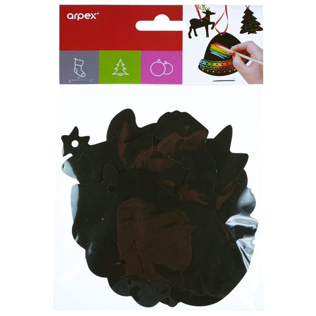 Zestaw zawieszek w świątecznych kształtach. Zawieszki pokryte są specjalną powłoką, pod którą znajduje się kolorowe tło. Na zawieszce można rysować dowolne wzory poprzez zdrapanie czarnej powłoki. Do zestawu dołączono wstążki umożliwiające zawieszenie elementu oraz drewniany patyczek do drapania. W opakowaniu znajdują się trzy sztuki produktu. Wymiary 10-13 cm.
