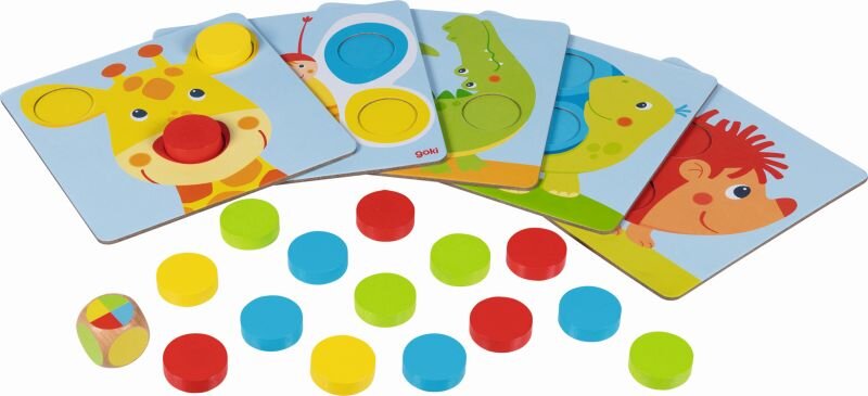 Edukacyjna gra dla dzieci sortowanie kolorów Goki zawiera: 5 drewnianych plansz z przyjazną grafiką ze zwierzątkami, pulę kolorowych klocków-puzzli do dopasowywania, kostkę do gry.