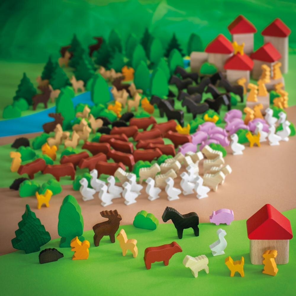Zestaw zawiera: 12 domów, 6 dachów, 12 drzew iglastych, 12 drzew liściastych, 6 jeleni, 18 saren, 18 krów, 12 koni, 12 świń, 12 owiec, 6 kotów, 12 królików, 18 gęsi, 8 jeży, 6 wiewiórek, 30 krzewów