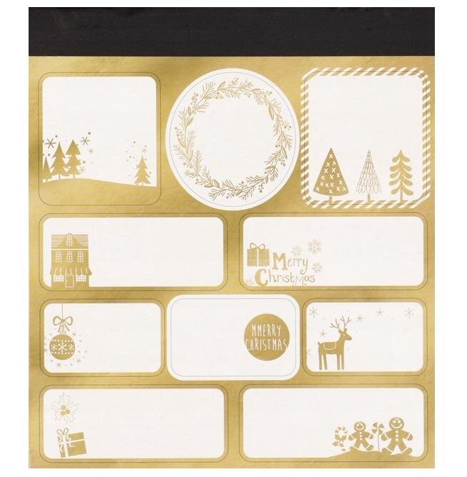 Zestaw naklejek świątecznych do podpisywania prezentów. W formie książeczki z 4 arkuszami naklejek, błyszczące złote wykończenie, 4 arkusze, ponad 40 naklejek