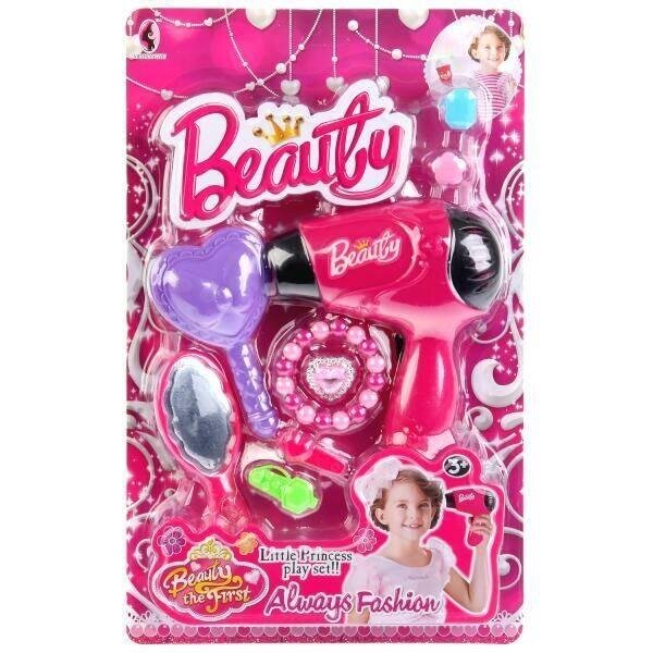 W komplecie suszarka na baterie, szczotka , pierścionki, spinki, bransoletka.